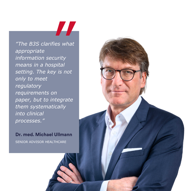 The sector-specific security standard (B3S) for hospitals is a security framework recognized by the German Federal Office for Information Security (BSI) in accordance with section 8a of the German BSI Act (BSIG). It specifies the legal requirements for operators of critical infrastructure (KRITIS) in the healthcare sector and defines the organizational and technical measures necessary to ensure information security.